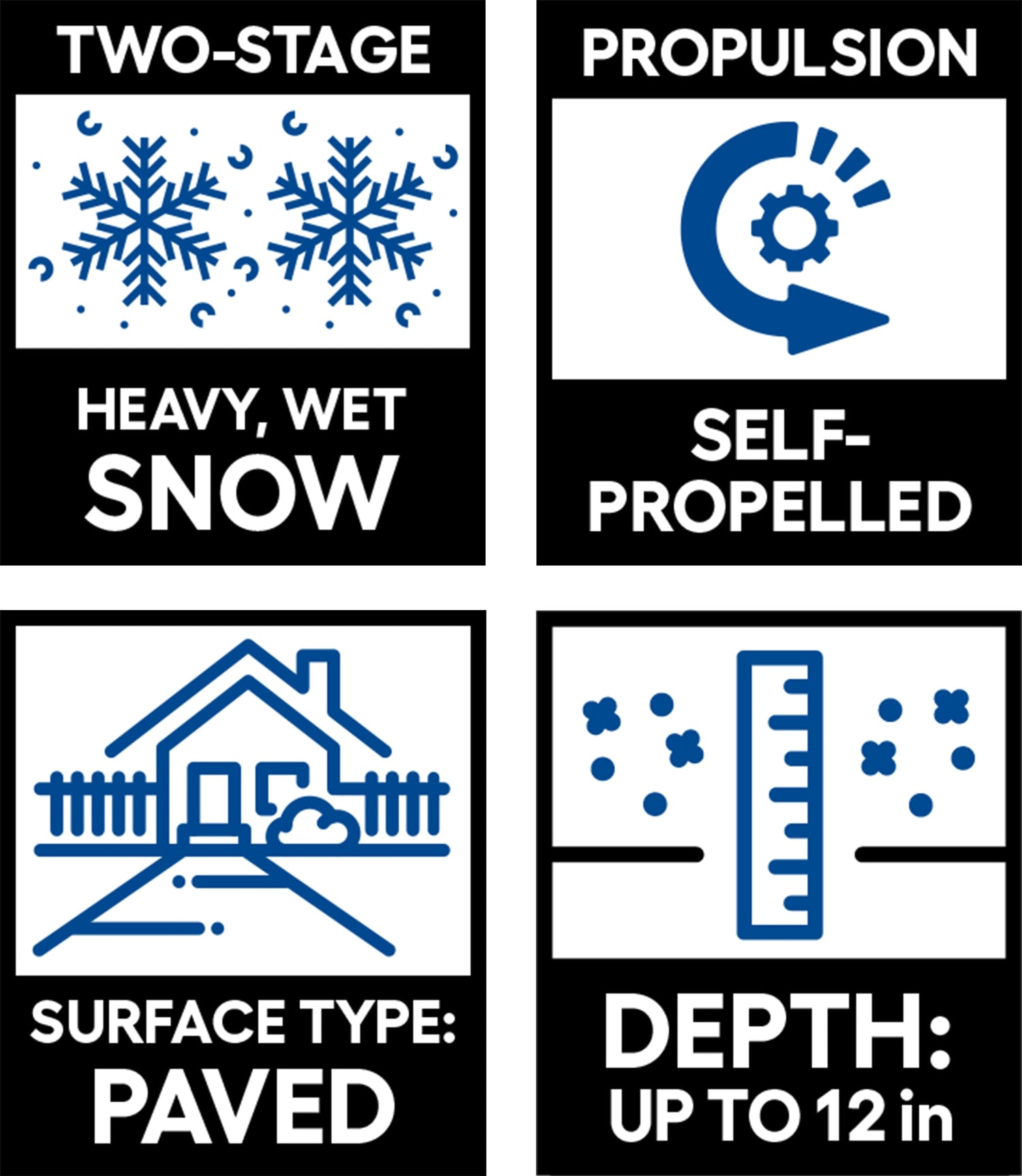 30 inch clearing width and intake height of 21 inches can clear up to 70 tons of snow per hour