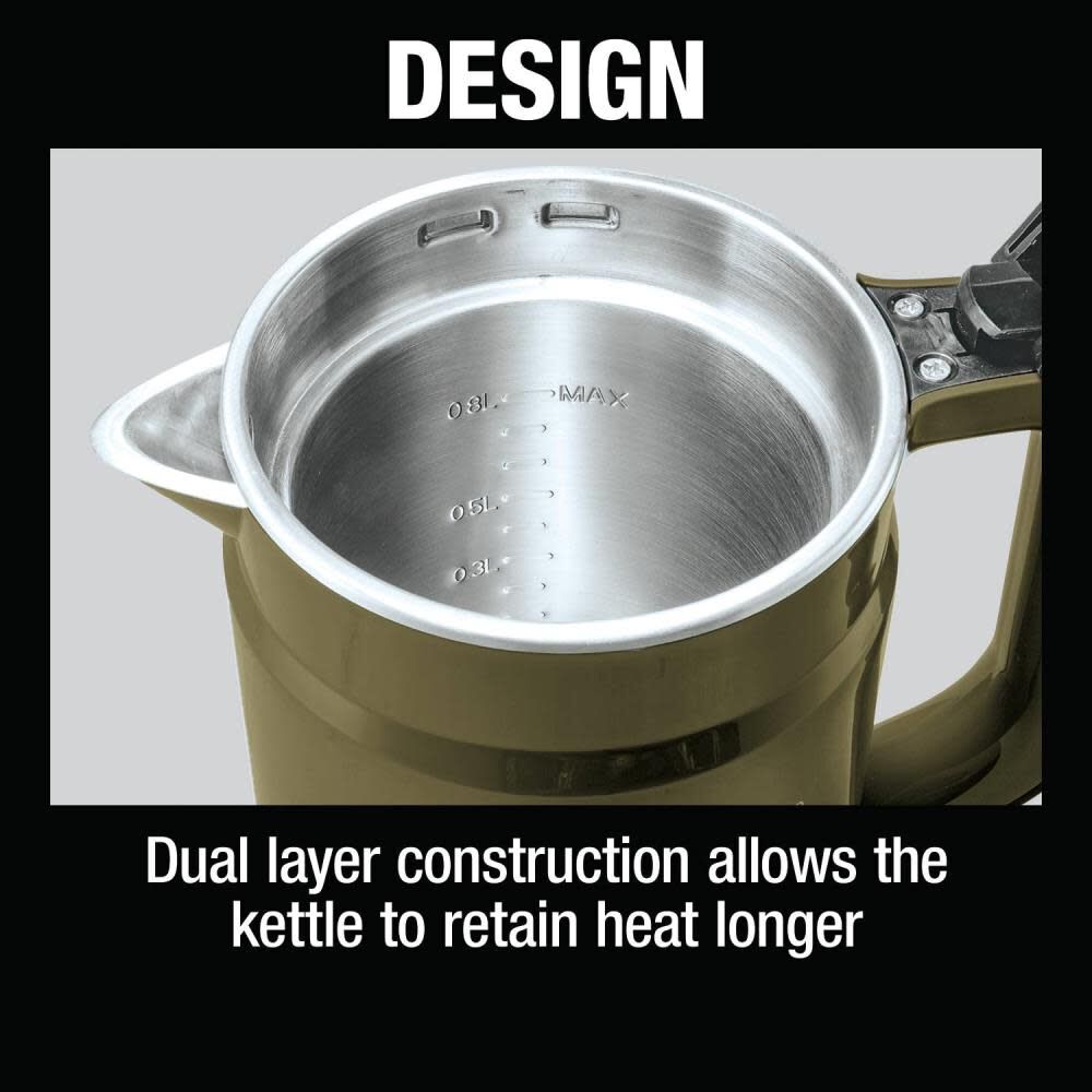 - Boils 27 oz. of water in 9 minutes from 50°F when powered by two 5.0Ah 18V LXT® batteries (batteries sold separately)