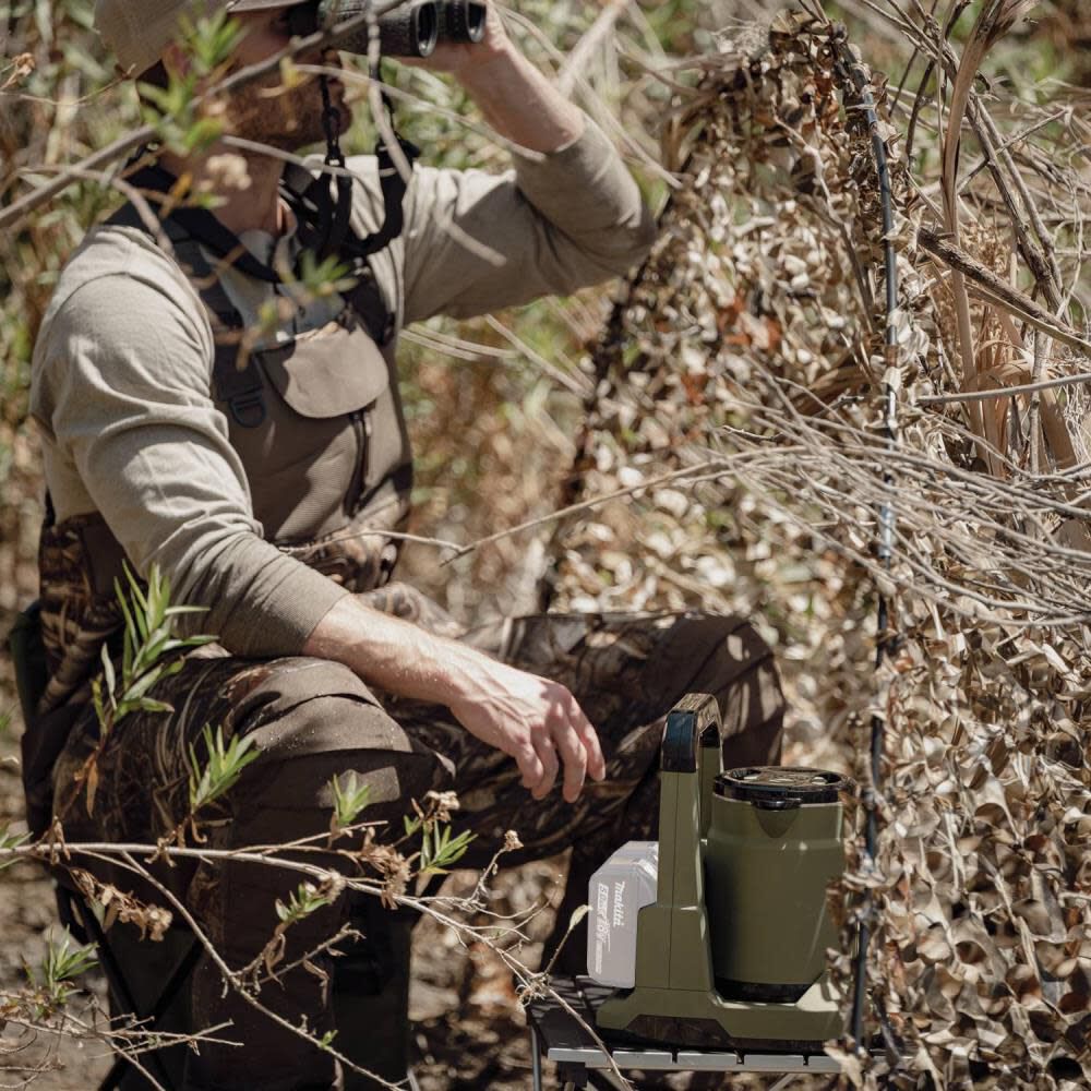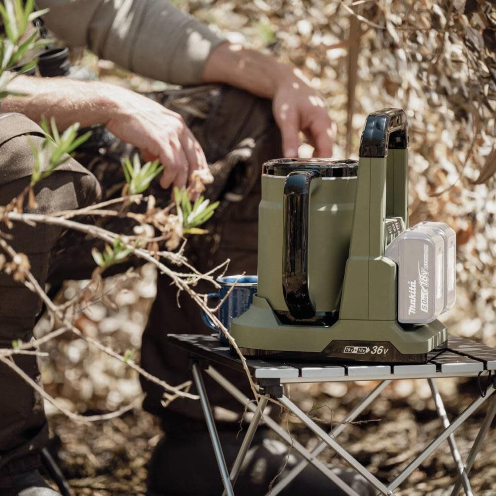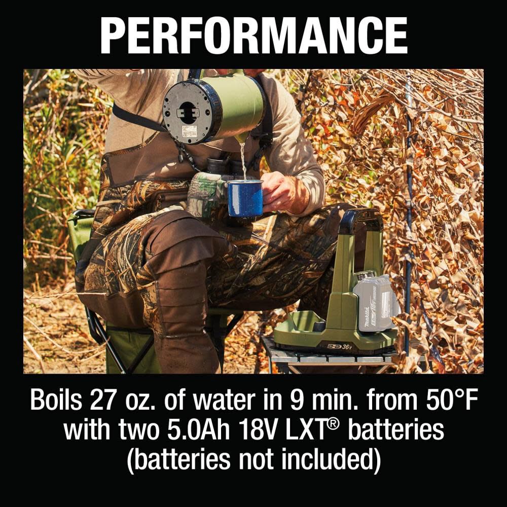 The MakitaÆ Outdoor Adventure LXTÆ 36 Volts hot water kettle helps to boil up to 27 oz water in only 9 minutes.