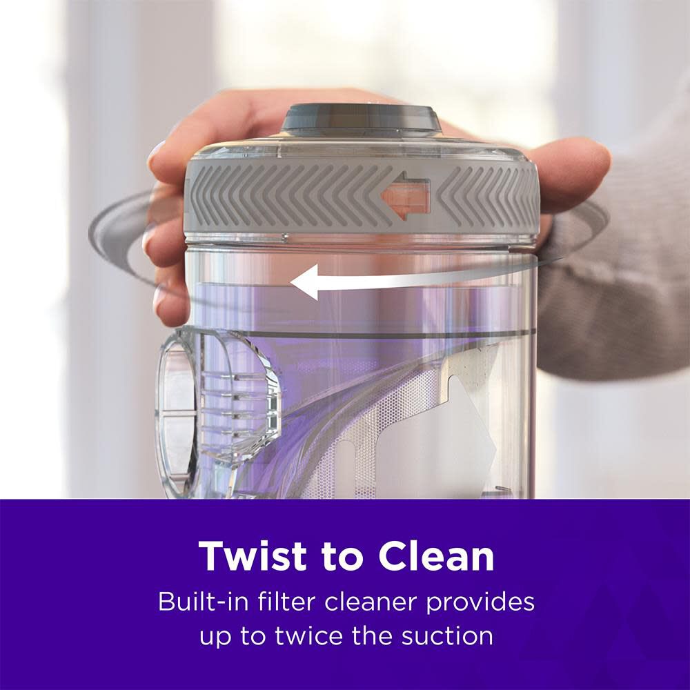 - Twist to clean: built-in filter cleaner provides up to twice the suction