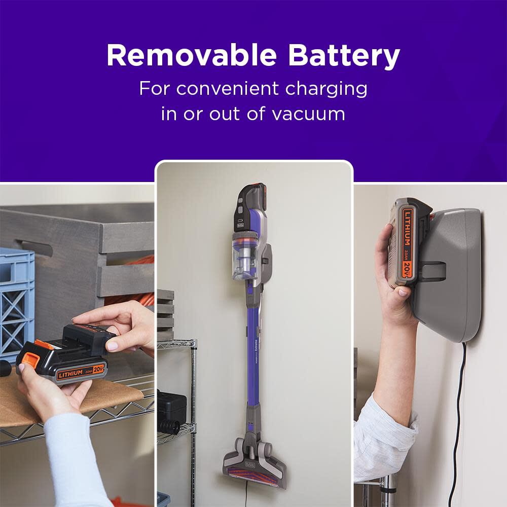 Detach the removable 20V MAX (maximum initial battery voltage (measured without workload) is 20 volts, nominal voltage is 18) battery to charge separately from the vacuum, or leave in your vacuum to charge while it self stands or when placed on its wall mount.