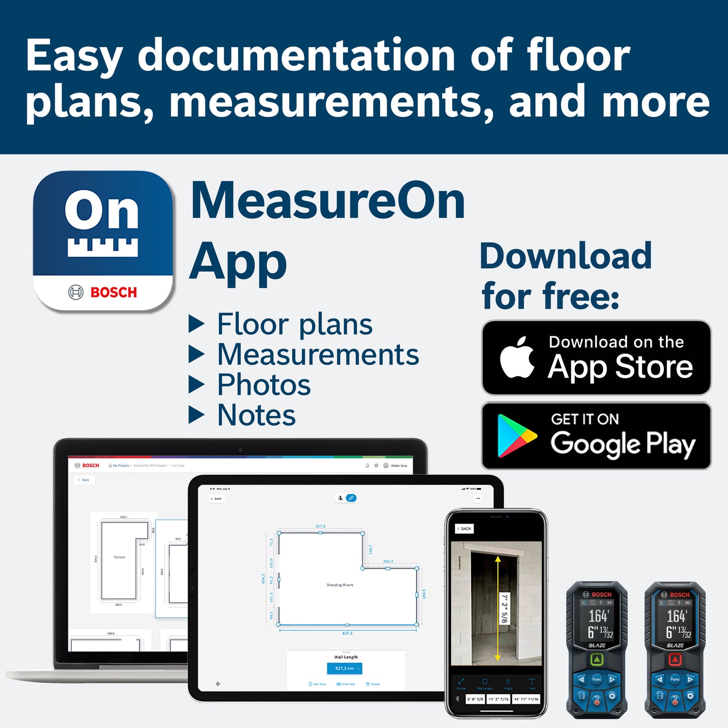 Bluetooth Smart 4 Technology – allows measurements to be digitally transferred to a smart phone or tablet using the free Bosch MeasureOn app