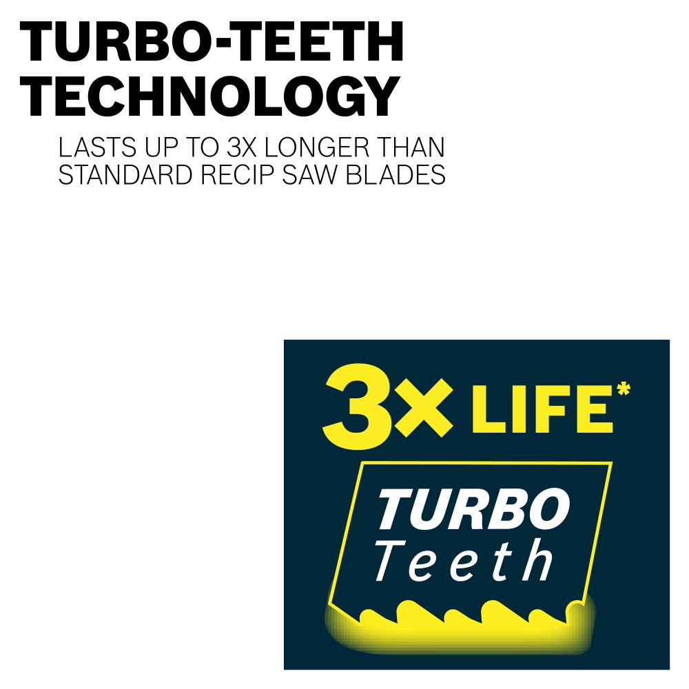 Turbo-Teeth technology – lasts up to 3X longer than standard reciprocating saw blades