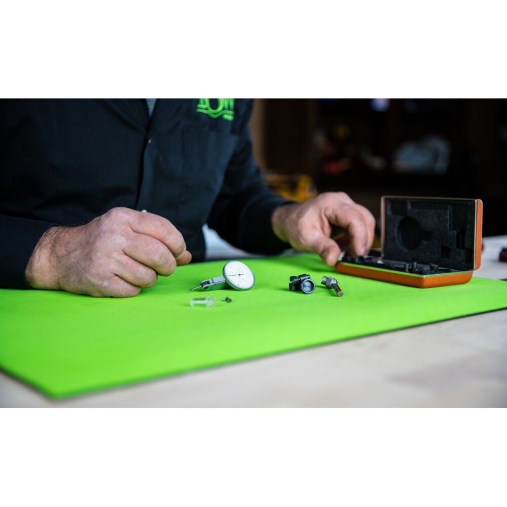 Bench mat holds small pieces in place and keeps your eye on them as they standout against the green Bow background.