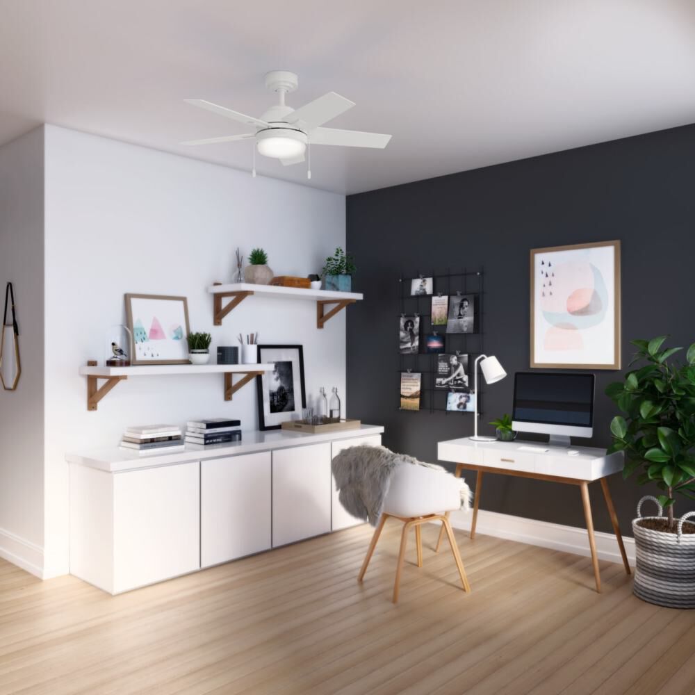 This small ceiling fan provides LED light and whisper quiet airflow in small rooms like laundry rooms, home offices, and guest bedrooms.