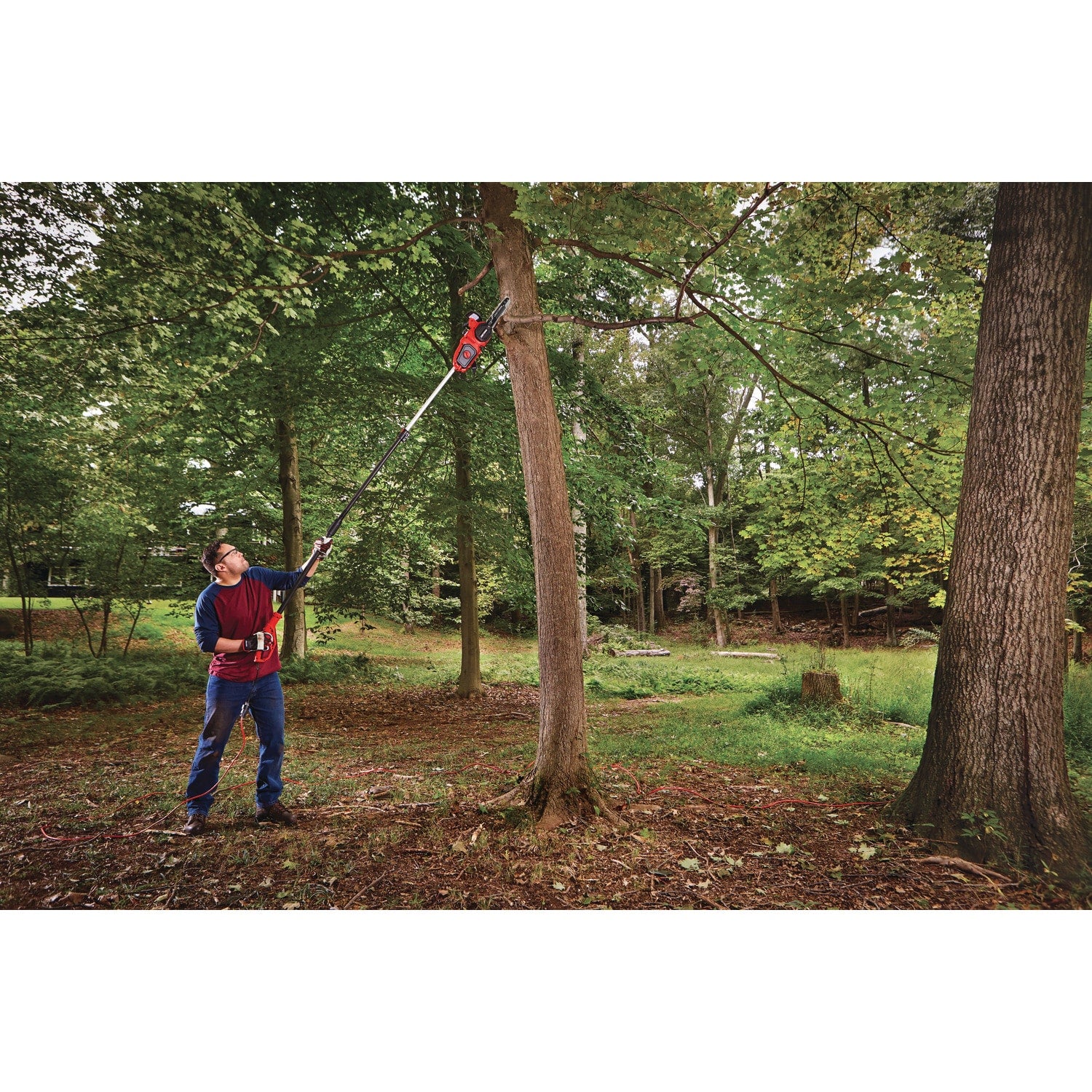 The versatility of this electric chainsaw allows it to be used as a regular handheld chainsaw and then as a pole chainsaw with the included extension pole giving you up to a 15-foot reach.