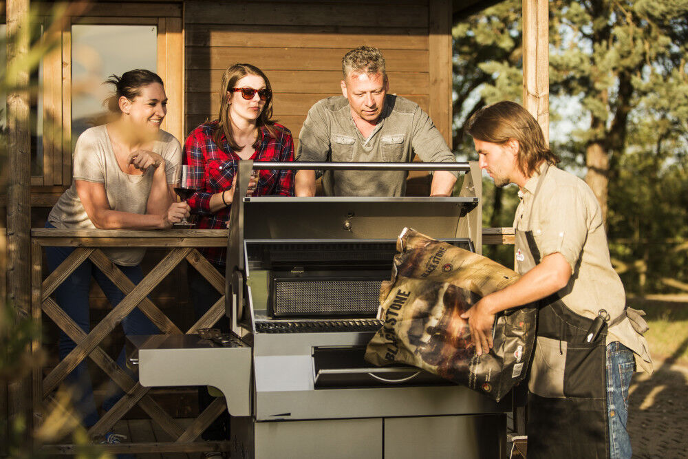 The slide-out ash and drip pan keeps cleanup simple.