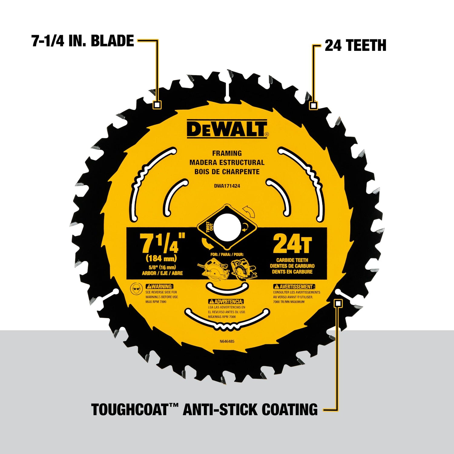 The DEWALT 7-1/4-inch 24-tooth tungsten carbide-tipped steel circular saw blade is tough enough to cut plywood, softwood (redwood, fir, spruce, etc.), and hardwood (mahogany, cherry, walnut, etc.) for construction and home improvement projects.