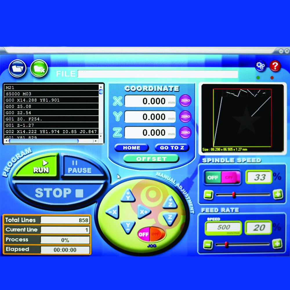 • Upload your design file to the table via a USB drive, then use the convenient handheld controller to move the spindle