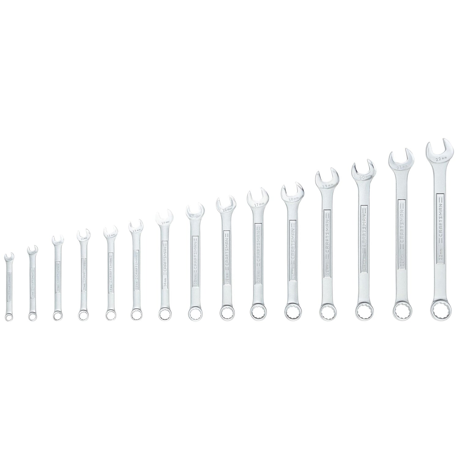 Includes (15) Combination Wrenches Metric (8mm, 9mm, 10mm, 11mm, 12mm, 13mm, 14mm, 15mm, 16mm, 17mm, 18mm, 19mm, 20mm, 21mm, 22mm)
