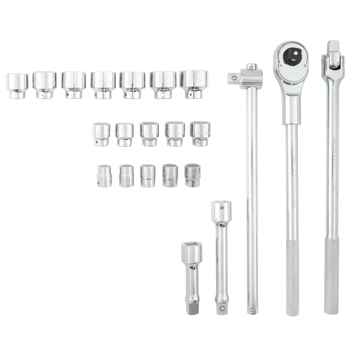 This set includes 1 Quick Release Ratchet, 17 Shallow Hand Sockets, 2 Extension Bars, and 1 Sliding T-Handle.