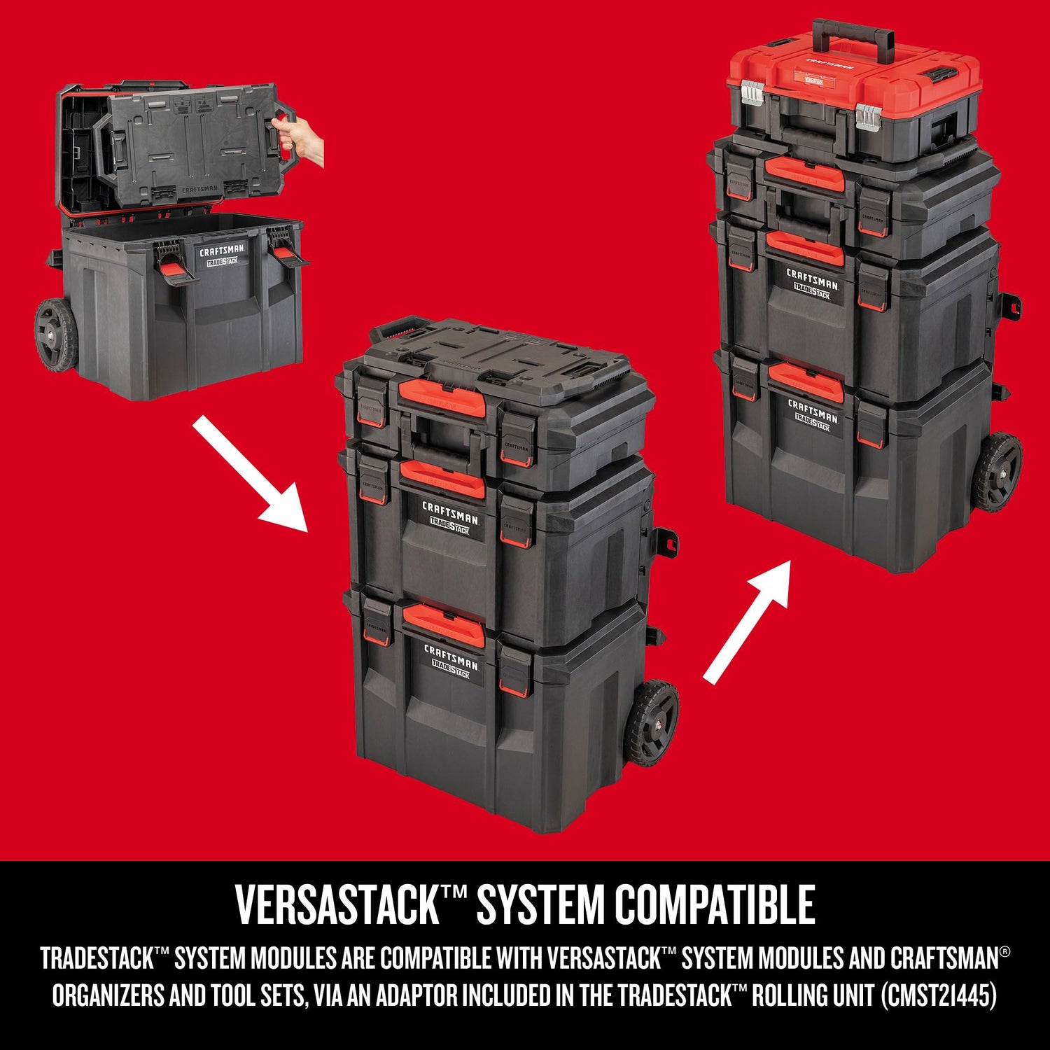 COMPATIBLE WITH VERSASTACK™ MODULES and CRAFTSMAN® organizers and tool sets, via an adaptor included in the TRADESTACK™ Rolling Unit