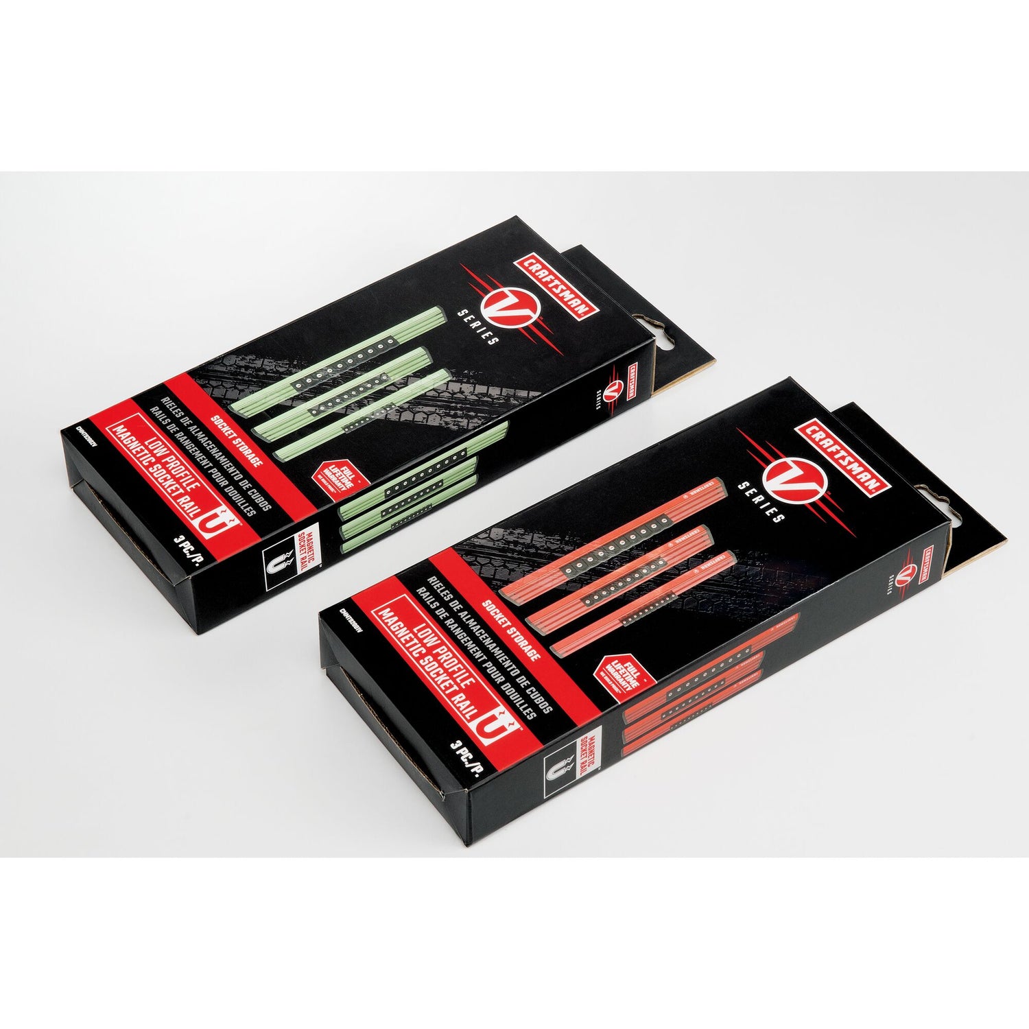 Package Contents: (1) Orange 1/4-in Drive 8-in Single Row Magnetic Socket Rail with 10 Nubs ; (1) Orange 3/8-in Drive 8-in Triple Row Magnetic Socket Rail with 10 Nubs ; (1) Orange 1/2-in Drive 10-in Triple Row Magnetic Socket Rail with 10 nubs