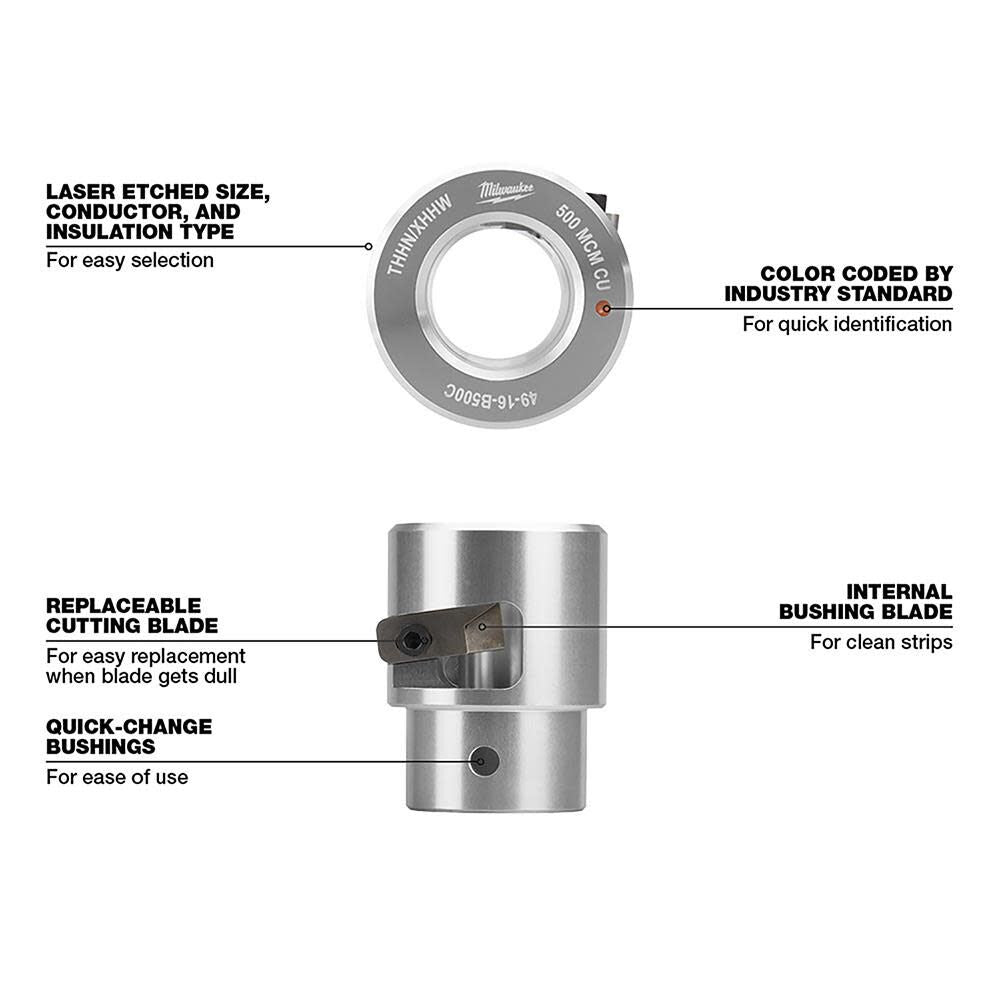 The MILWAUKEEÆ M12 Cable Stripper Kit with 17 Cu THHN / XHHW Bushings vastly improves the cable stripping experience.