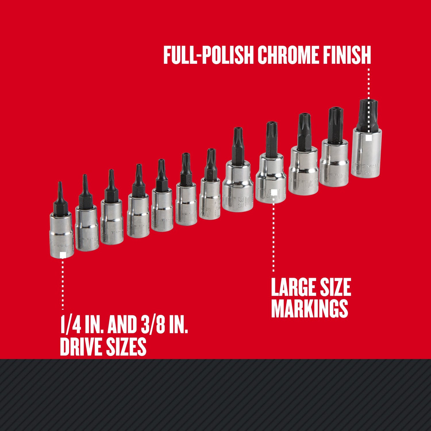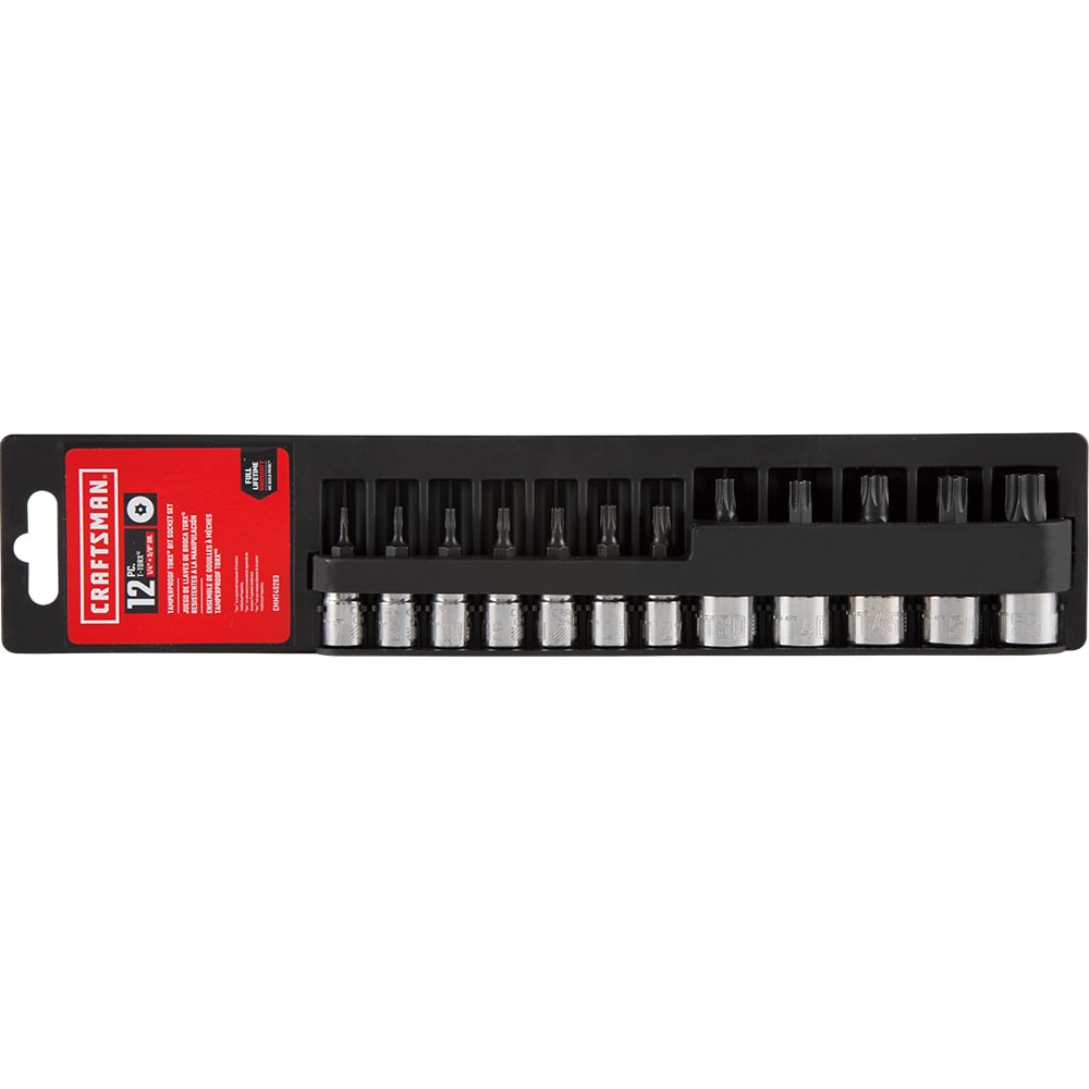 Includes (7) 1/4-in Drive Tamperproof Torx Bit Sockets (TT7, TT8, TT10, TT15, TT20, TT25, TT27) and (5) 3/8-in Drive Tamperproof Torx Bit Sockets (TT30, TT40, TT45, TT50, TT55)
