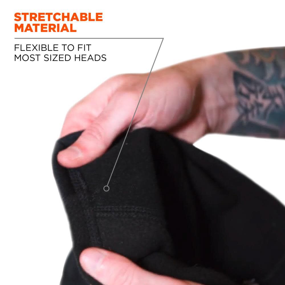 One size fits most and can be worn alone or under hard hats, ski helmets or other head protection.