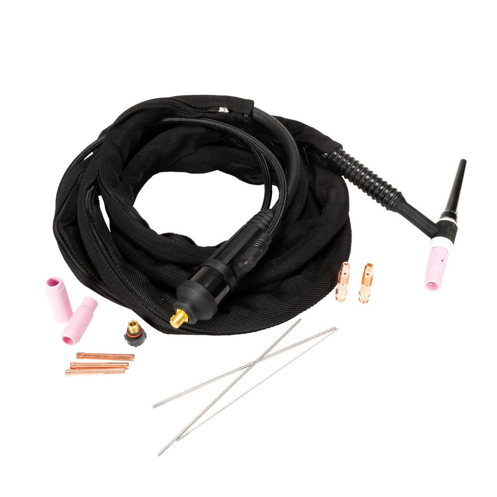 - Size 17 air-cooled, two-piece TIG torch with flexible neck
