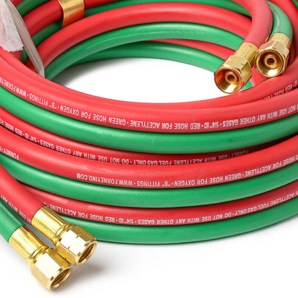 The Forney 1/4" x 25' R-Grade Oxy-Acetylene Hose is designed to be used with oxygen-acetylene only: the red hose is for use with acetylene, the green hose is for use with oxygen.