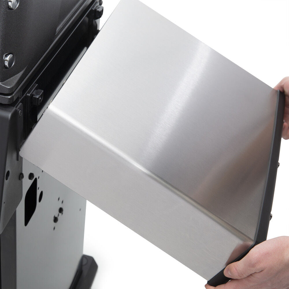 Primary cooking space, stainles steel warming rack, stainless steel cooking grids, stainless steel Flav-R-Wave cooking system, 4 stainless steel Dual-Tube burners, and stainless steel drop-down side shelves and an enclosed cabinet base.