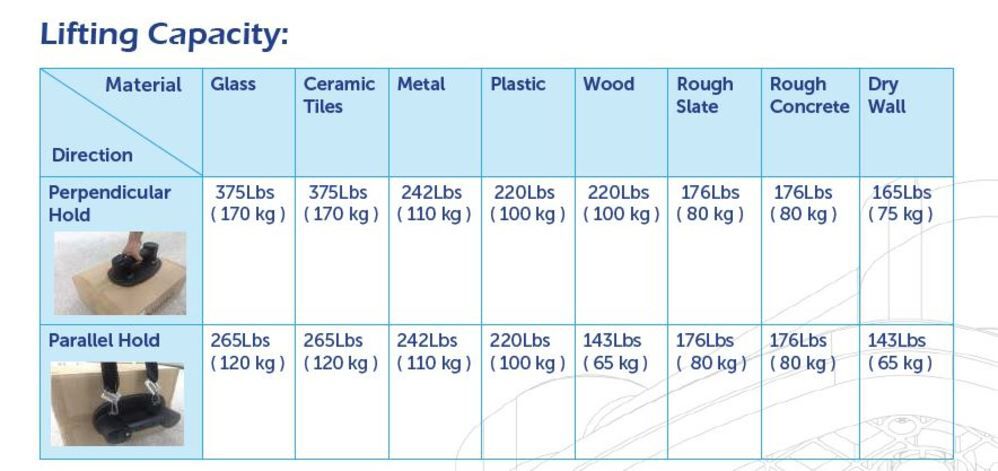 It effortlessly handles nearly any surface weighing up to 375 lbs (170 kgs), making it a reliable choice for a wide range of lifting tasks.