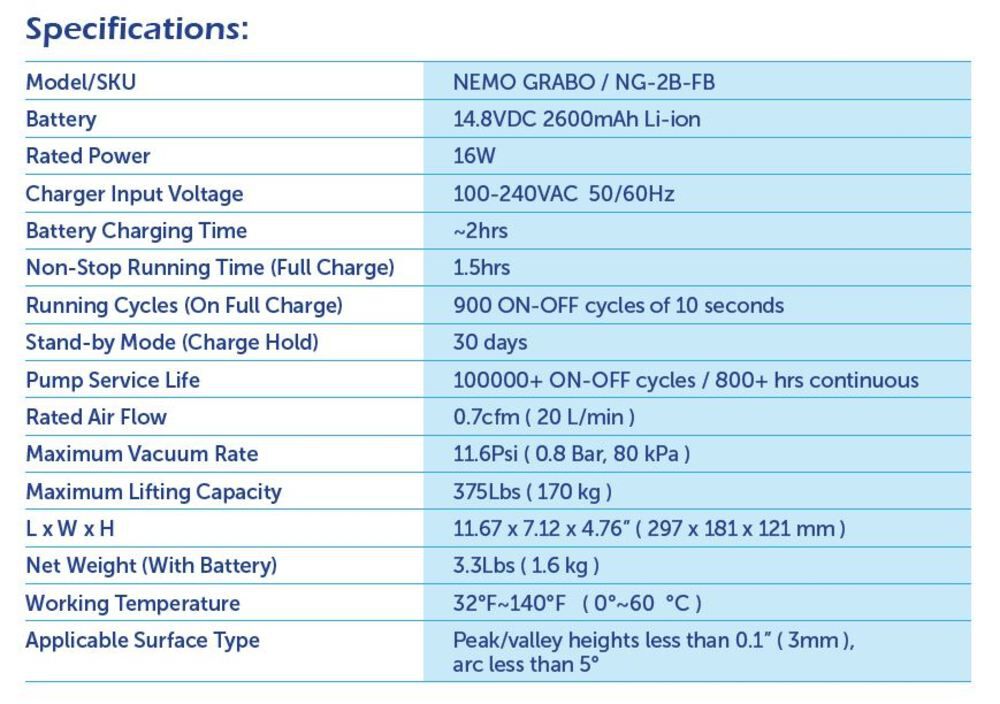 - Includes: GRABO Classic portable electric vacuum lifter with analog pressure gauge. Battery and battery charger. Foam Rubber Seal preinstalled on the tool. Rugged nylon carrying bag. Replacement filters.