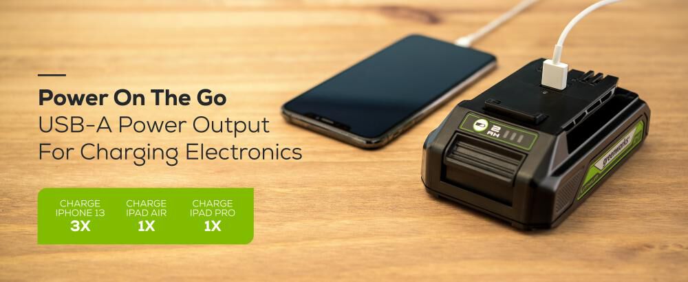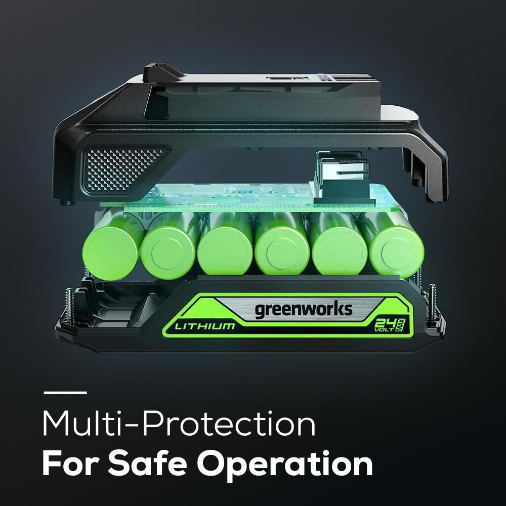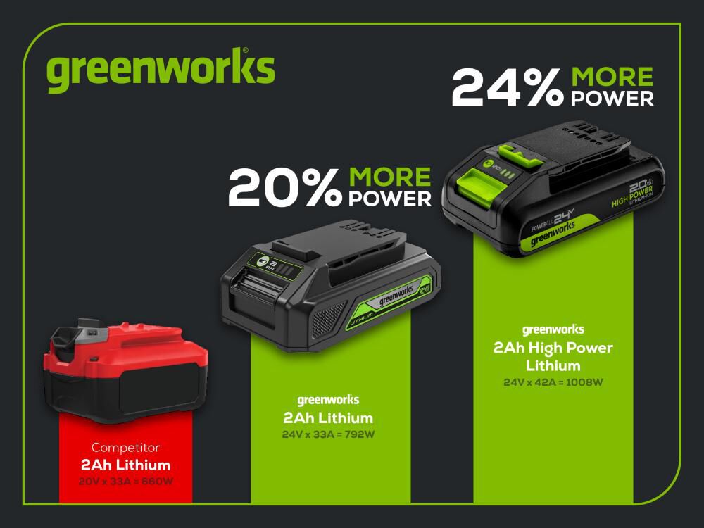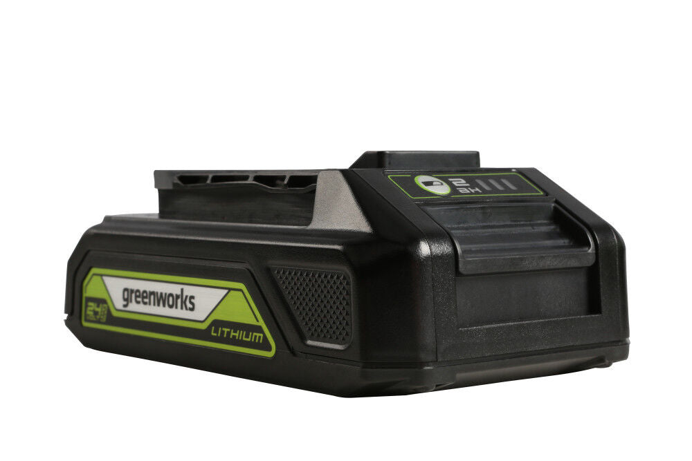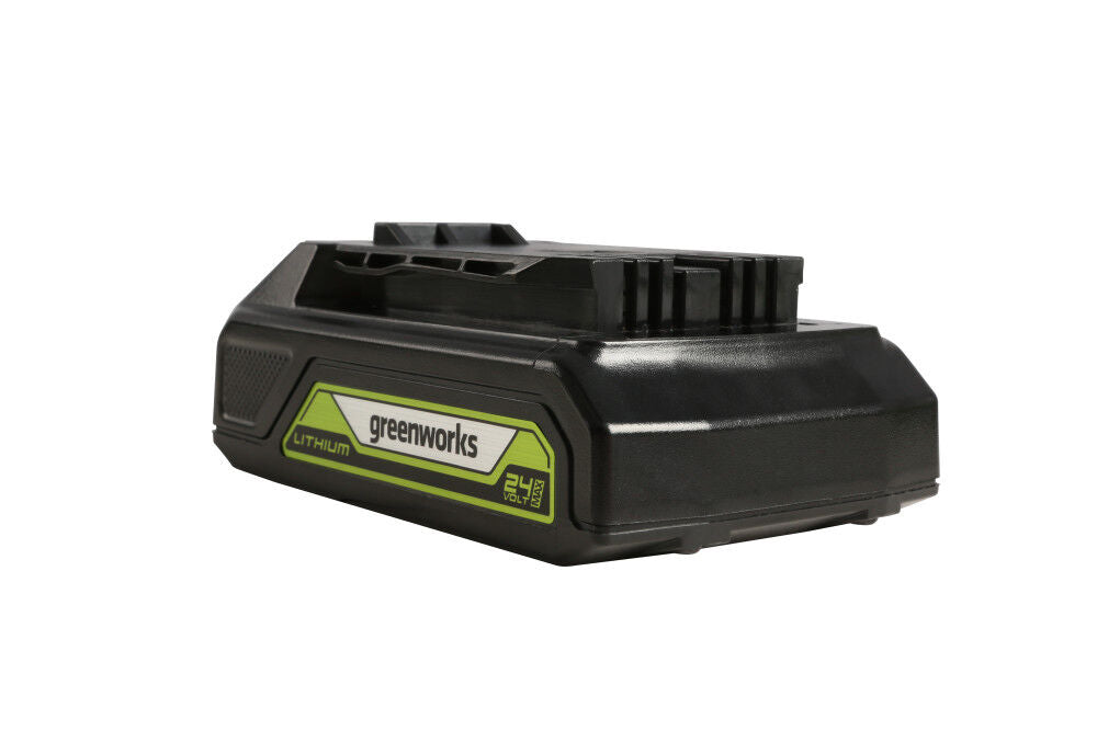 - Greenworks 24 volt 2 AH lithium-ion battery delivers fade-free power