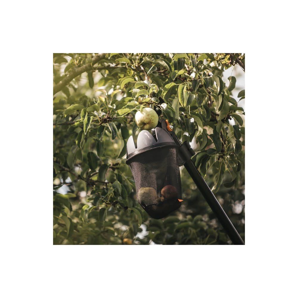 - Fiskars® Fruit Picker Basket harvests fruit from tall trees without bruising or scratching