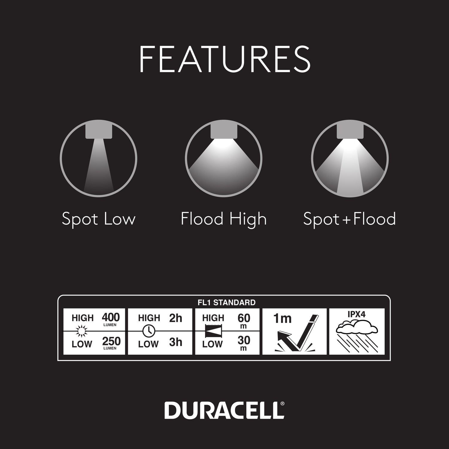 3 Light modes: switch between flood high (400 lumens), spot low (250 lumens), and spot and flood (dual-beam) for the perfect lighting for any environment
