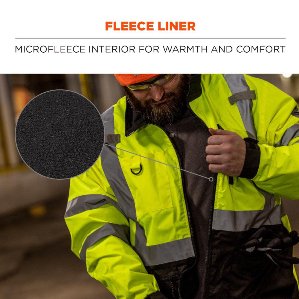 This Type R Class 3 lightweight hi-vis jacket features 2 lower front pockets, 1 upper chest cell phone pocket, 1 dual slot pen pocket, 1 zippered fleece-lined interior pocket, 3 d-rings and 2 mic tabs for convenient access and storage.