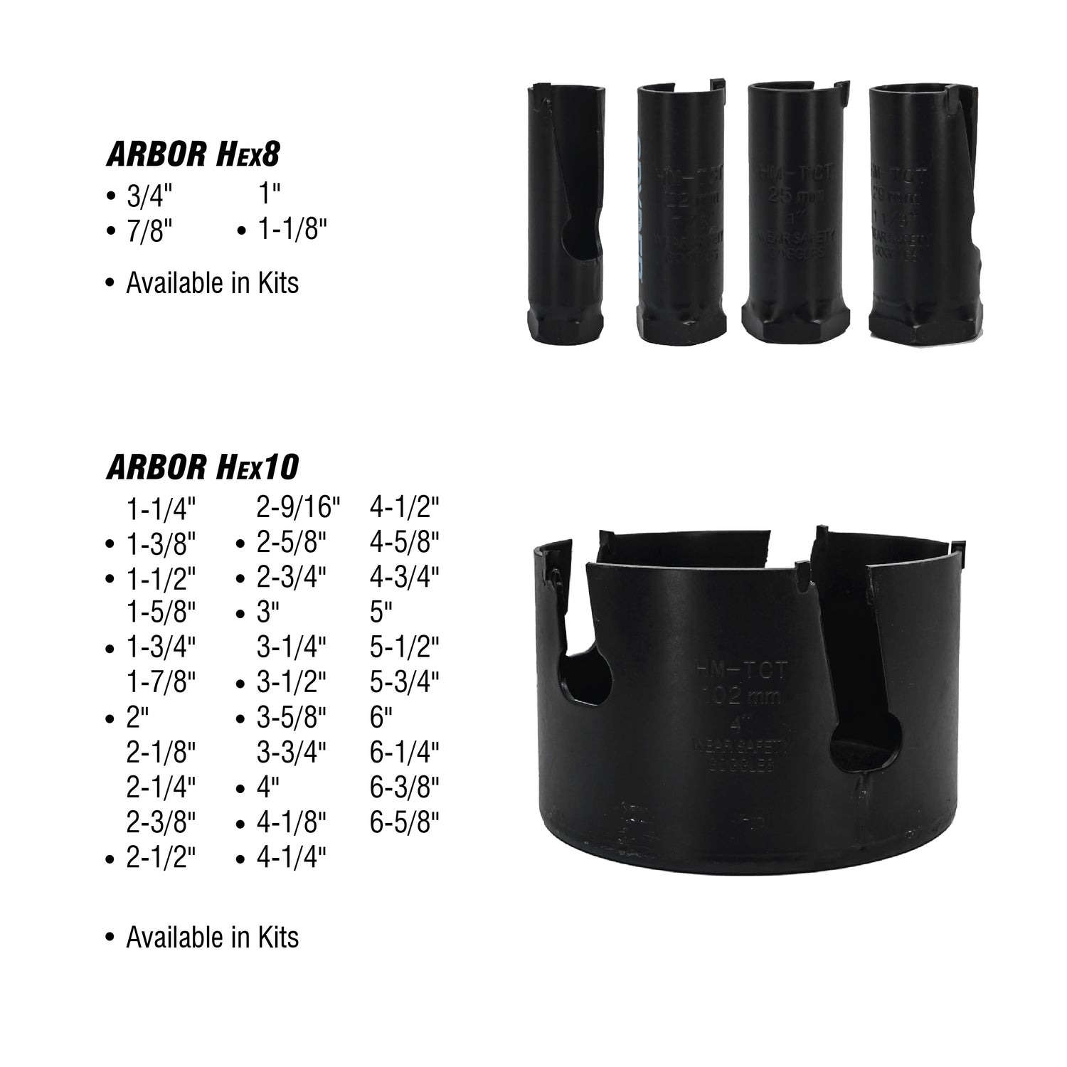 14-piece kit contains (11) hole saws: 1-3/8, 1-1/2, 1-3/4, 2, 2-1/2, 2-3/4, 3, 3-1/2, 4, 4-1/4, 4-1/2; (2) pilot bits: Hex10 TCT, Hex10 HSS; (1) arbor: Hex10 in a hard storage case.