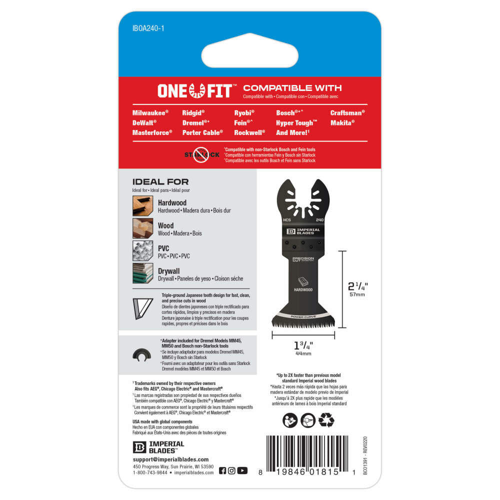 Imperial Blades' One Fit 1-3/4" Japanese Tooth Power Curve Hardwood Blade is composed of high carbon steel (HCS) for medium-duty wood applications.