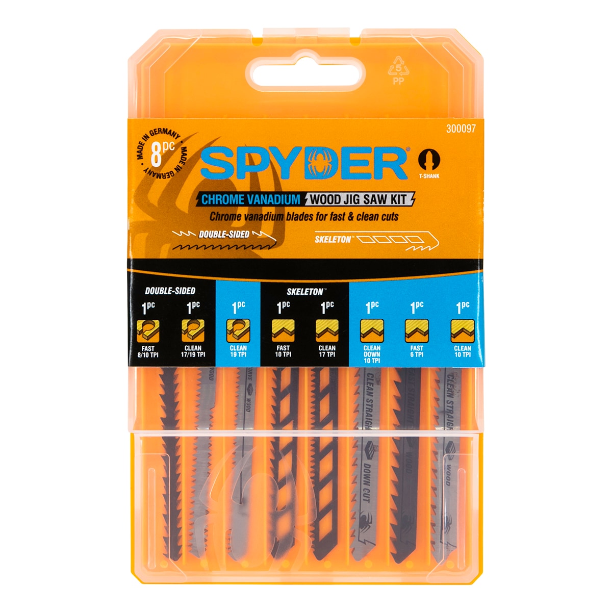 8pc set includes CrV blades: double-sided fast cut blades (2x), double-sided clean cut blades (2x), Skeleton fast cut blades (2x), Skeleton clean cut blades (2x), case.