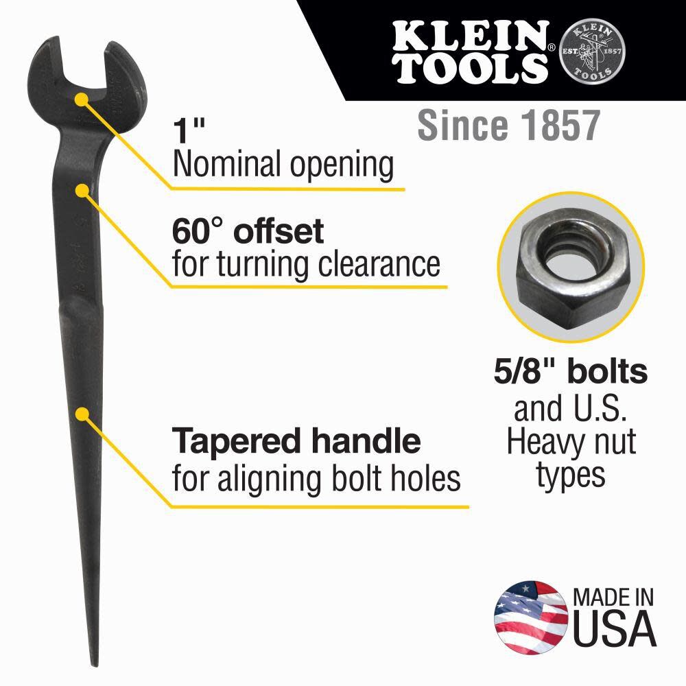 Forged from select alloy steel, the Klein Tools 1-Inch Nominal Opening Spud Wrench is designed to withstand high-leverage and heavy loads.