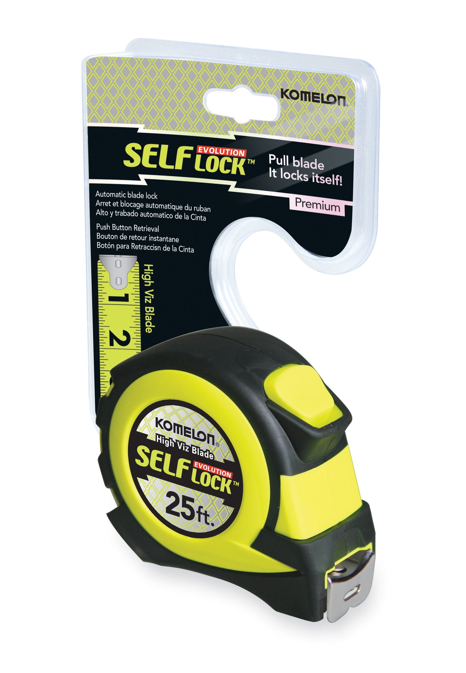 Self locking blade stays extended until user returns with push button for easier one person measuring