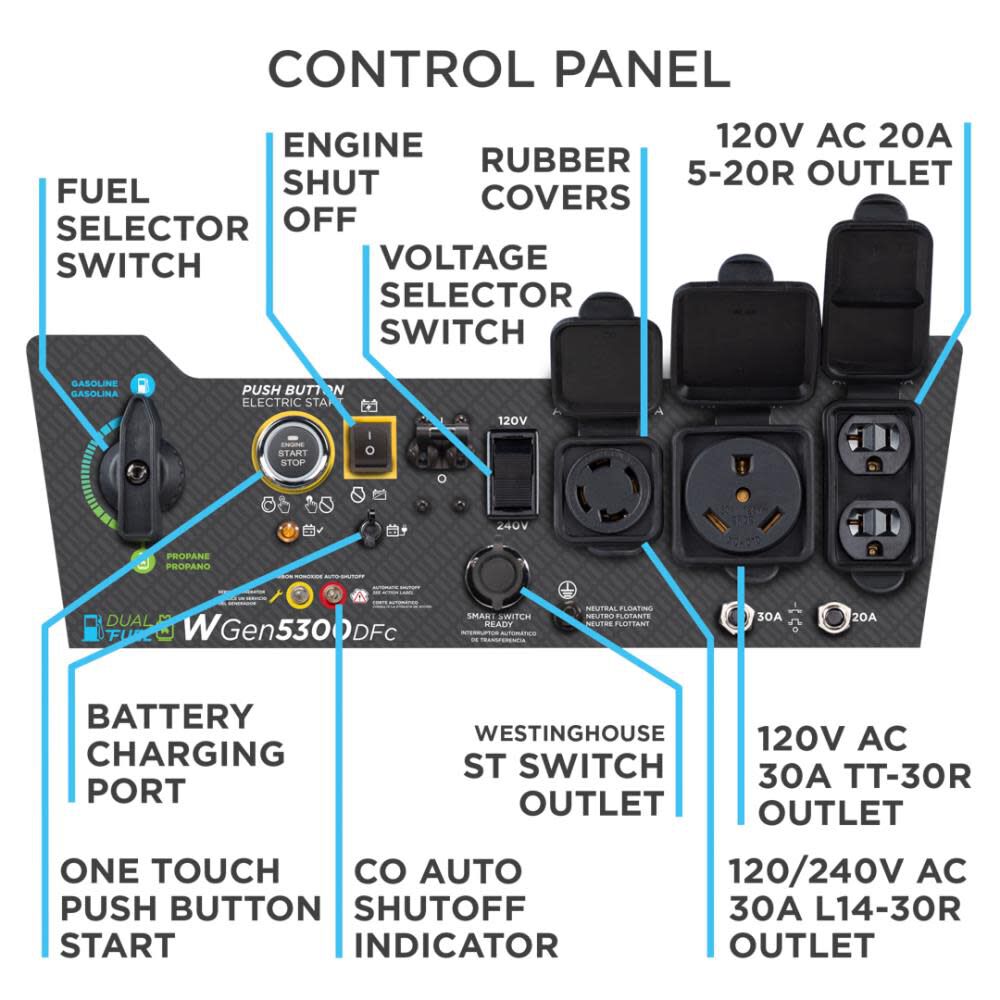 The intuitive control panel features an adjustable 120/240 Volt Selector Switch to draw more power with added flexibility for higher voltage appliances like well pumps.