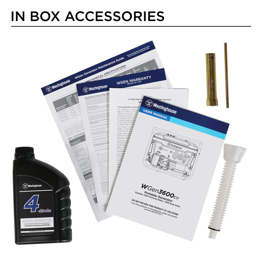 Package Contents - WGen3600cv, Oil Bottle, Oil Funnel, Spark Plug Wrench