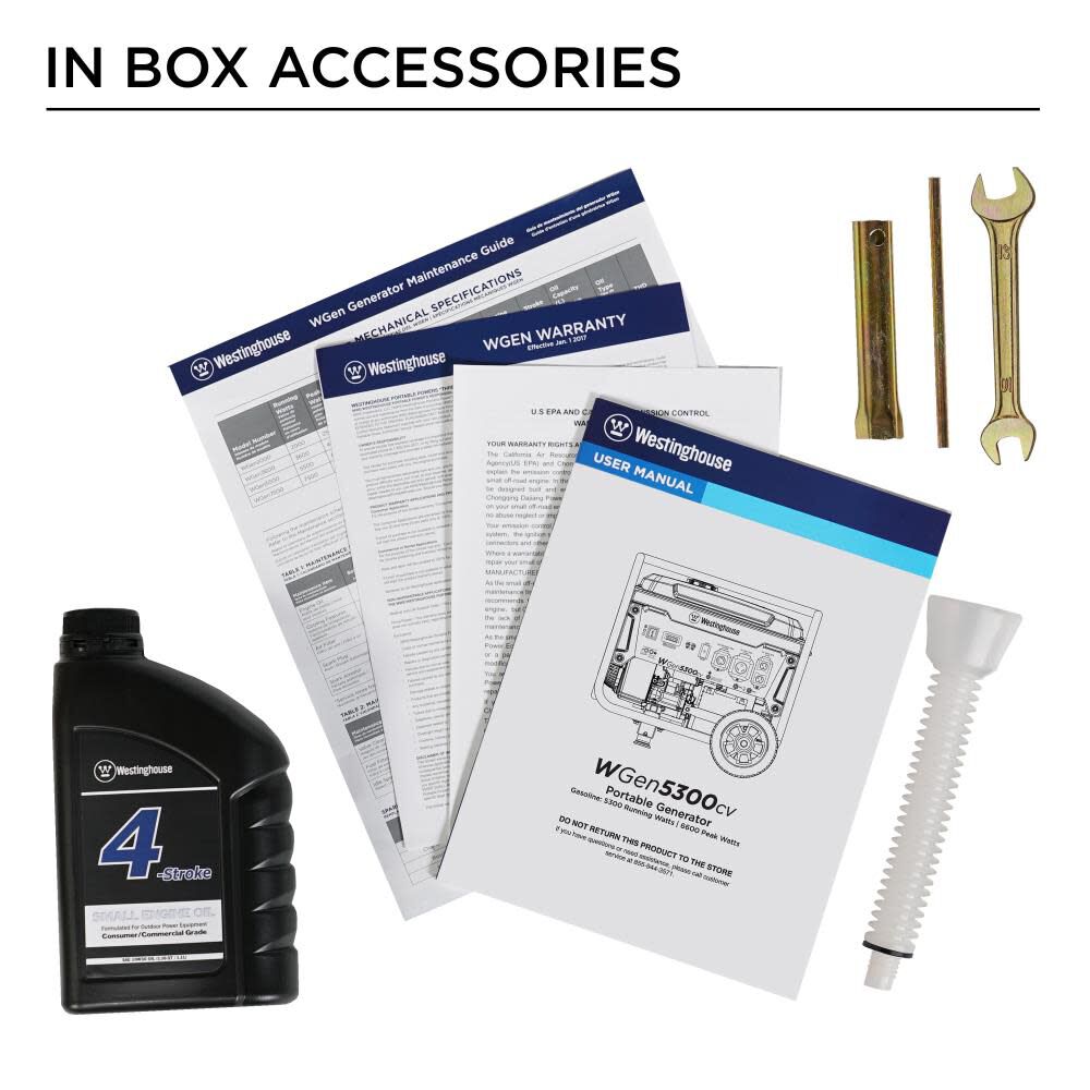Package Contents - WGen5300cv, Oil Bottle, Oil Funnel, Spark Plug Wrench,Wheel Kit