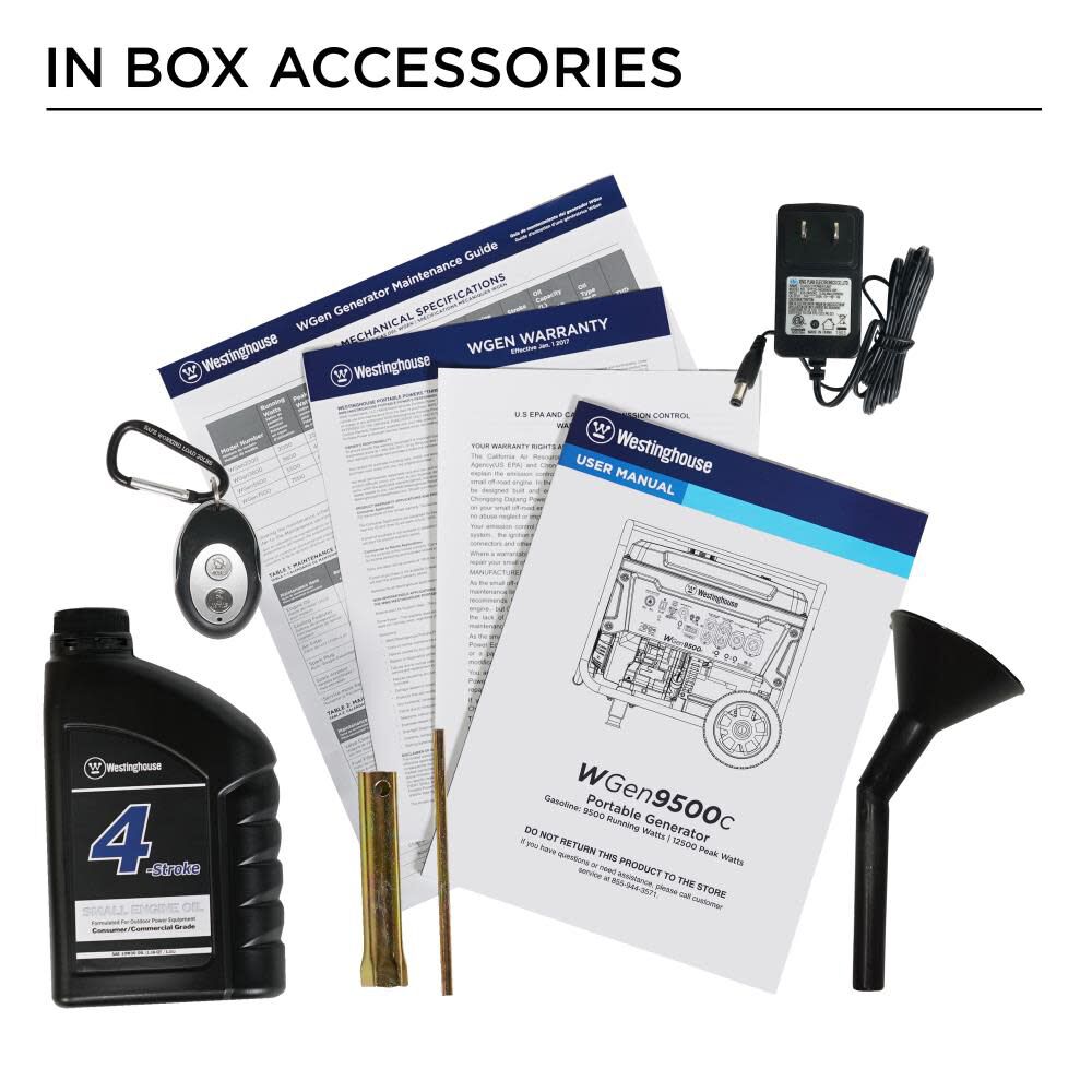Package Contents - WGen9500c, Oil Bottle, Oil Funnel, Spark Plug Wrench, Remote, Battery Float Charger,Wheel Kit