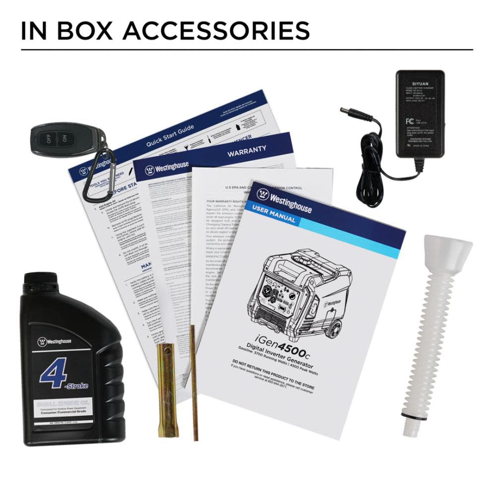 Package Contents - iGen4500c, Oil Bottle, Oil Funnel, Spark Plug Wrench, Remote, Battery Float Charger,Wheel Kit