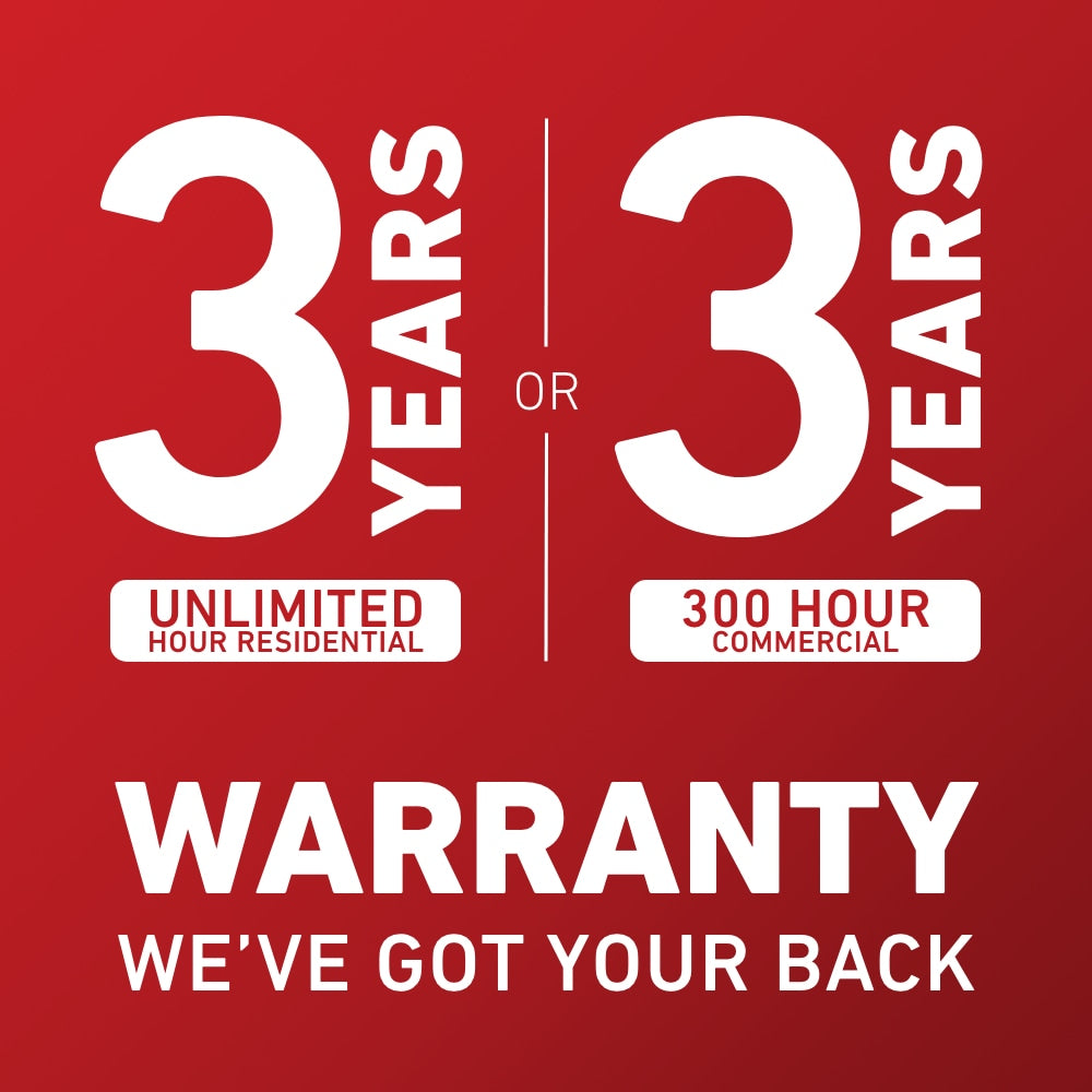 We've got you covered, enjoy peace of mind knowing you're covered by a 3-year unlimited hour residential warranty, plus a 3-year/300-hour commercial engine warranty and as a Toro owner, you'll have access to more than 3,000 servicing dealers across the US and Canada ready to assist you, count on it