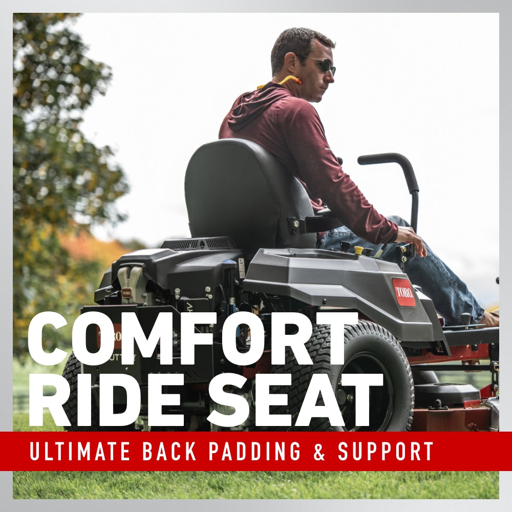 Creature comforts, enjoy a more comfortable mow with added features like an under-seat storage cubby, front step-through and cup holders.