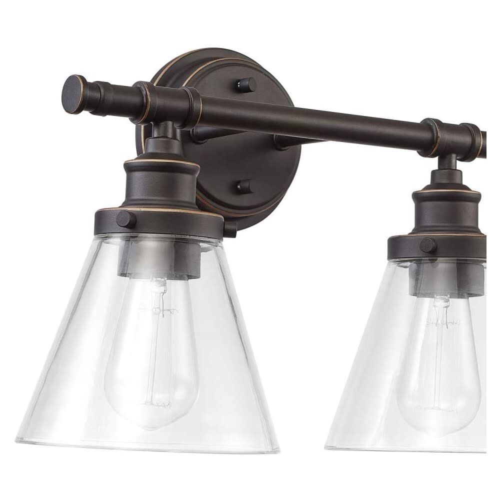 This 2-light fixture has clear glass shades in a vintage bronze finish that complements your existing decor.