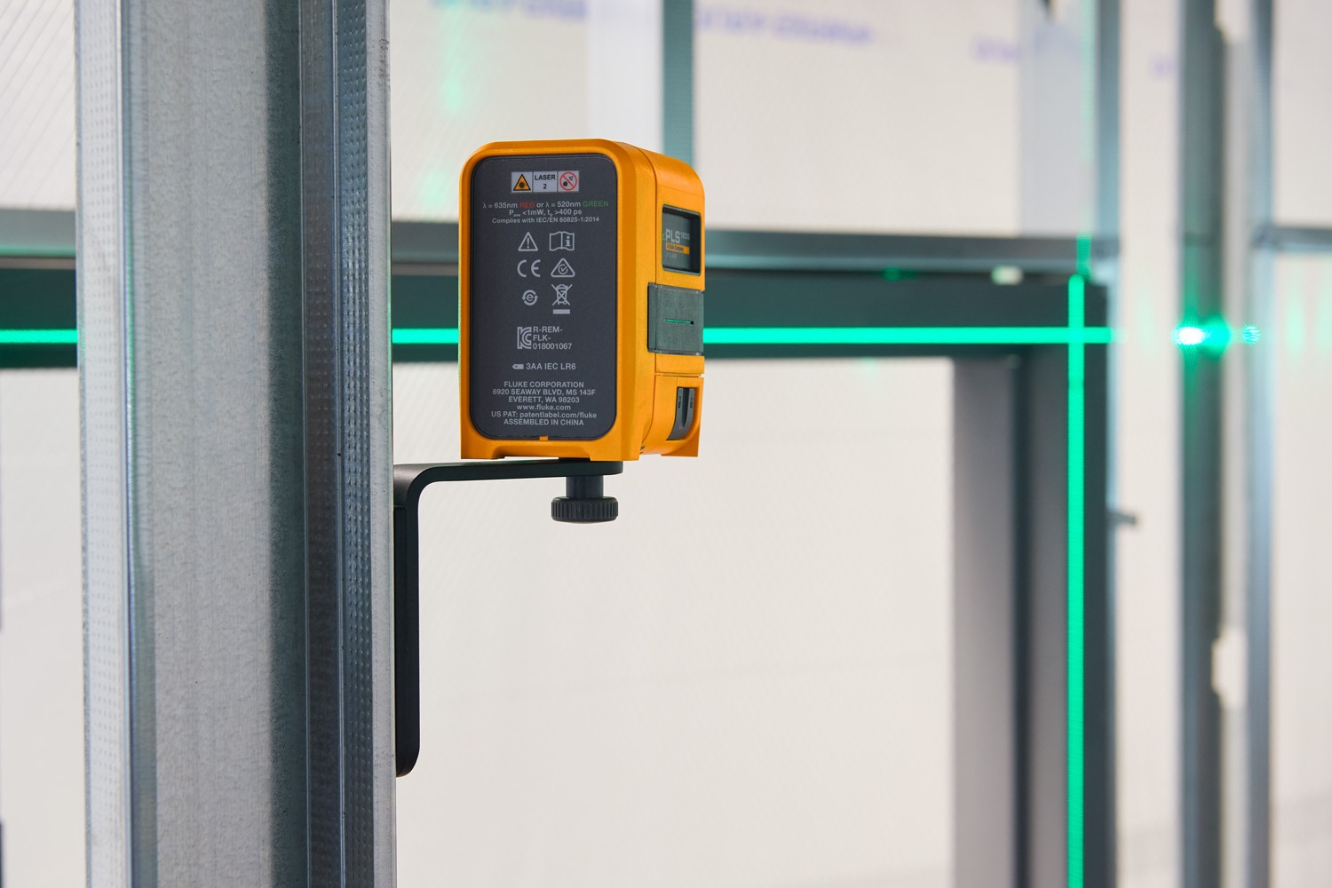 The kit includes RBP rechargeable battery pack, floor stand, magnetic L-bracket, and UB9 wall and ceiling bracket for fast, easy overhang and center line measurements