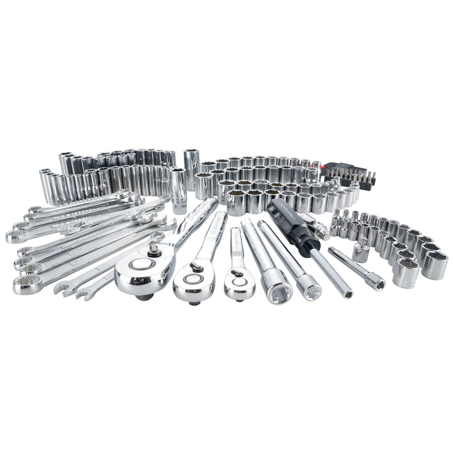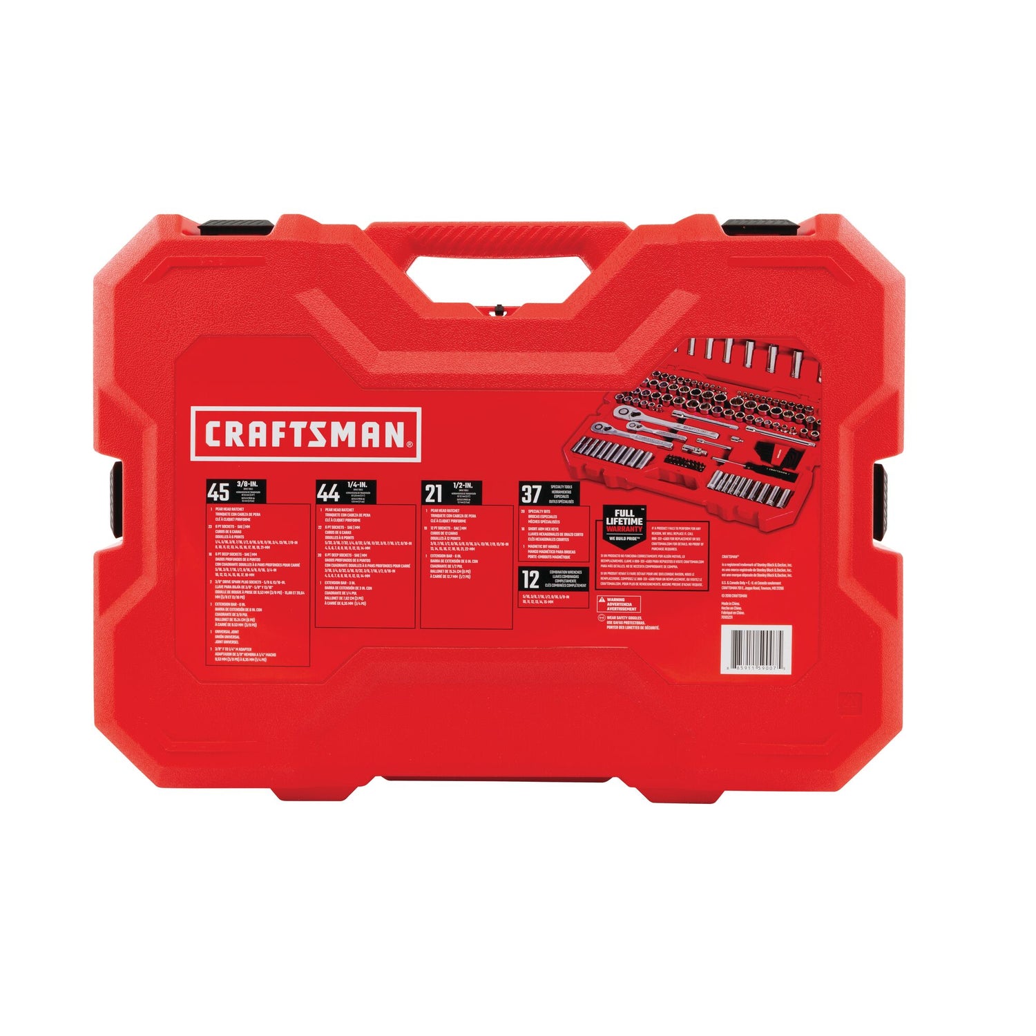 159 pc set includes (11) 1/4-in Drive Shallow 6 PT Sockets SAE (5/32, 3/16, 7/32, 1/4, 9/32, 5/16, 11/32, 3/8, 7/16, 1/2, 9/16-in), (11) 1/4-in Drive Shallow 6 PT Sockets Metric (4, 5, 6, 7, 8, 9, 10, 11, 12, 13, 14mm), (9) 1/4-in Drive Deep 6 PT Sockets SAE (3/16, 1/4, 9/32, 5/16, 11/32, 3/8, 7/16, 1/2, 9/16-in), (11) 1/4-in Drive Deep 6 PT Sockets Metric (4, 5, 6, 7, 8, 9, 10, 11, 12, 13, 14mm), (11) 3/8-in Drive Shallow 6 PT Sockets SAE (1/4, 5/16, 3/8, 7/16, 1/2, 9/16, 5/8, 11/16, 3/4, 13/16, 7/8-in), (12) 3/8-in Drive Shallow 6 PT Sockets Metric (8, 10, 11, 12, 13, 14, 15, 16, 17, 18, 19, 21mm), (8) 3/8-in Drive Deep 6 PT Sockets SAE (5/16, 3/8, 7/16, 1/2, 9/16, 5/8, 11/16, 3/4-in), (7) 3/8-in Drive Deep 6 PT Sockets Metric (10, 12, 13, 14, 15, 16, 17, 18mm), (10) 1/2-in Drive Shallow 12 PT Sockets SAE (3/8, 7/16, 1/2, 9/16, 5/8, 11/16, 3/4, 13/16, 7/8, 15/16-in), (9) 1/2-in Drive Shallow 12 PT Sockets Metric (13, 14, 15, 16, 17, 18, 19, 21, 22mm), (2) 3/8-in Drive Spark Plug Sockets (5/8-in and 13/16-in), (1) 1/4-in Drive Ext Bar (3-in), (1) 1/4-in Drive Bit Driver, (6) SAE Combination Wrenches (5/16, 3/8, 7/16, 1/2, 9/16, 5/8-in), (6) Metric Combination Wrenches (10, 11, 12, 13, 14, 15mm), (16) Short Arm Hex Keys, (1) 1/4-in Drive Ratchet, (1) 3/8-in Drive Ratchet, (1) 1/2-in Drive Ratchet, (1)3/8-in Drive Size Adapter (1/4-in), (1) 3/8-in Drive Universal Joint and (20) Specialty Bits.