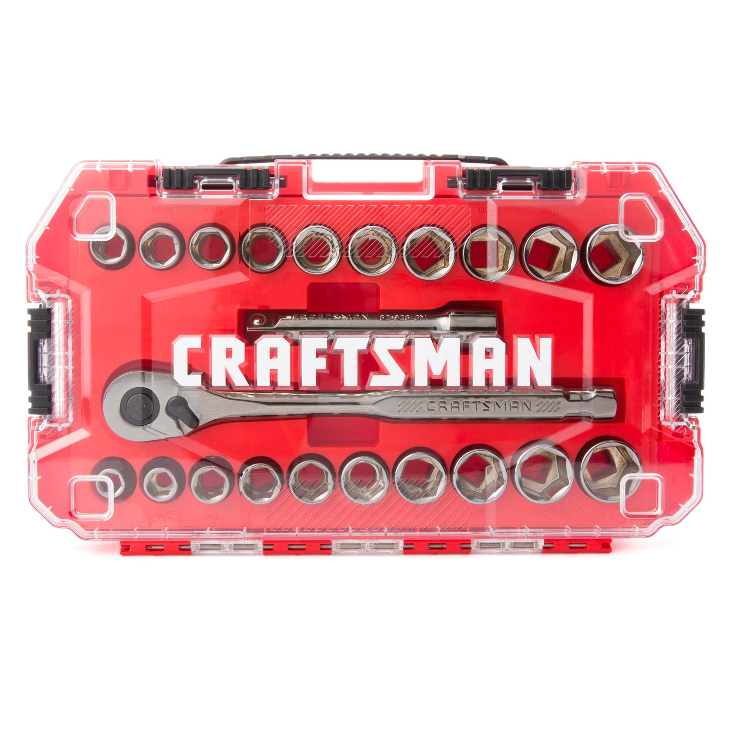 22 pc set includes (10) 1/2-in Drive Shallow 6 PT Sockets SAE (3/8, 7/16, 1/2, 9/16, 5/8, 11/16, 3/4, 13/16, 7/8, 15/16-in), (9) 1/2-in Drive Shallow 6 PT Sockets Metric (14, 15, 16, 17, 18, 19, 20, 21, 22mm), (1) 120T 1/2-in Ratchet, (1) 1/2-in Drive Extension Bar (5-in) and (1) 1/2-in Drive Universal Joint.