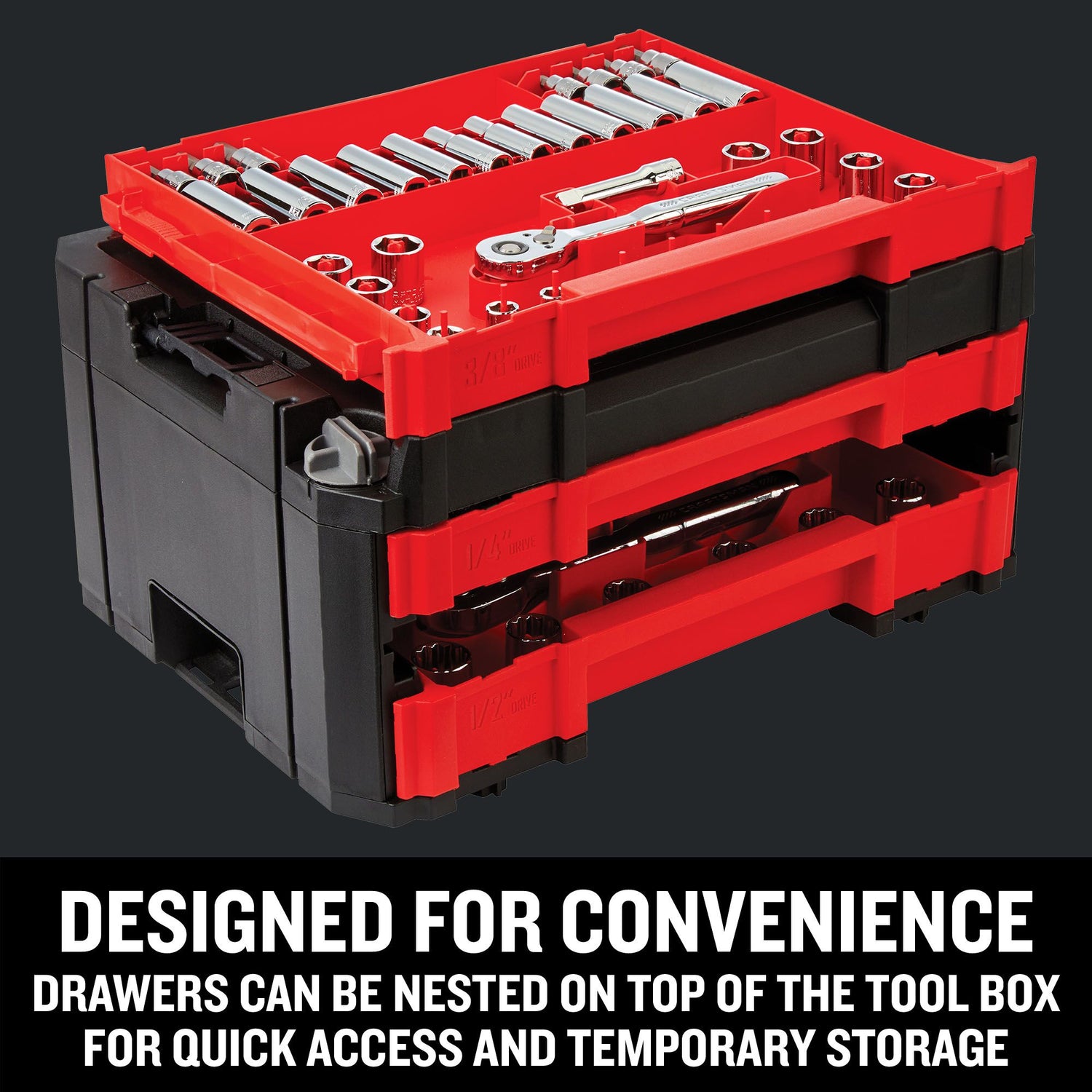 CONVENIENCE: Drawers can be nested on top of the tool box for easy access and temporary storage