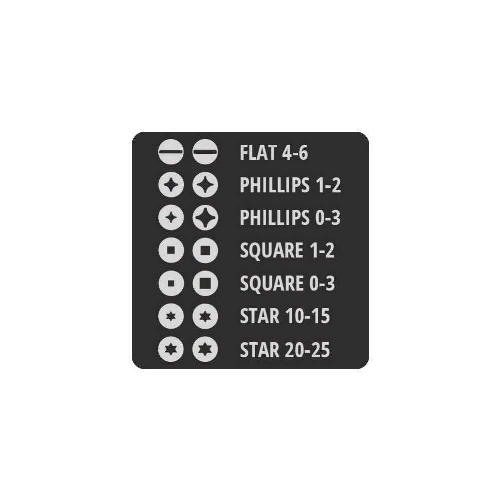- Bit Load - Phillips 0-3, Phillips 1-2, Torx 10-15, Torx 20-25, Square 0-3, Square 1-2, Flat 4-6, 1/4 In. Hex Shaft