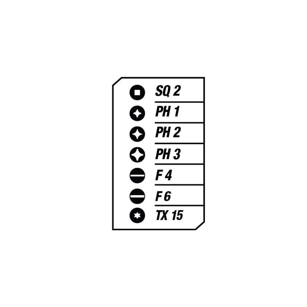 - Compatible Screwdriver Bits: Square #2, Philips #1, Philips #2, Philips #3, Flat 4, Flat 6, Torx 15