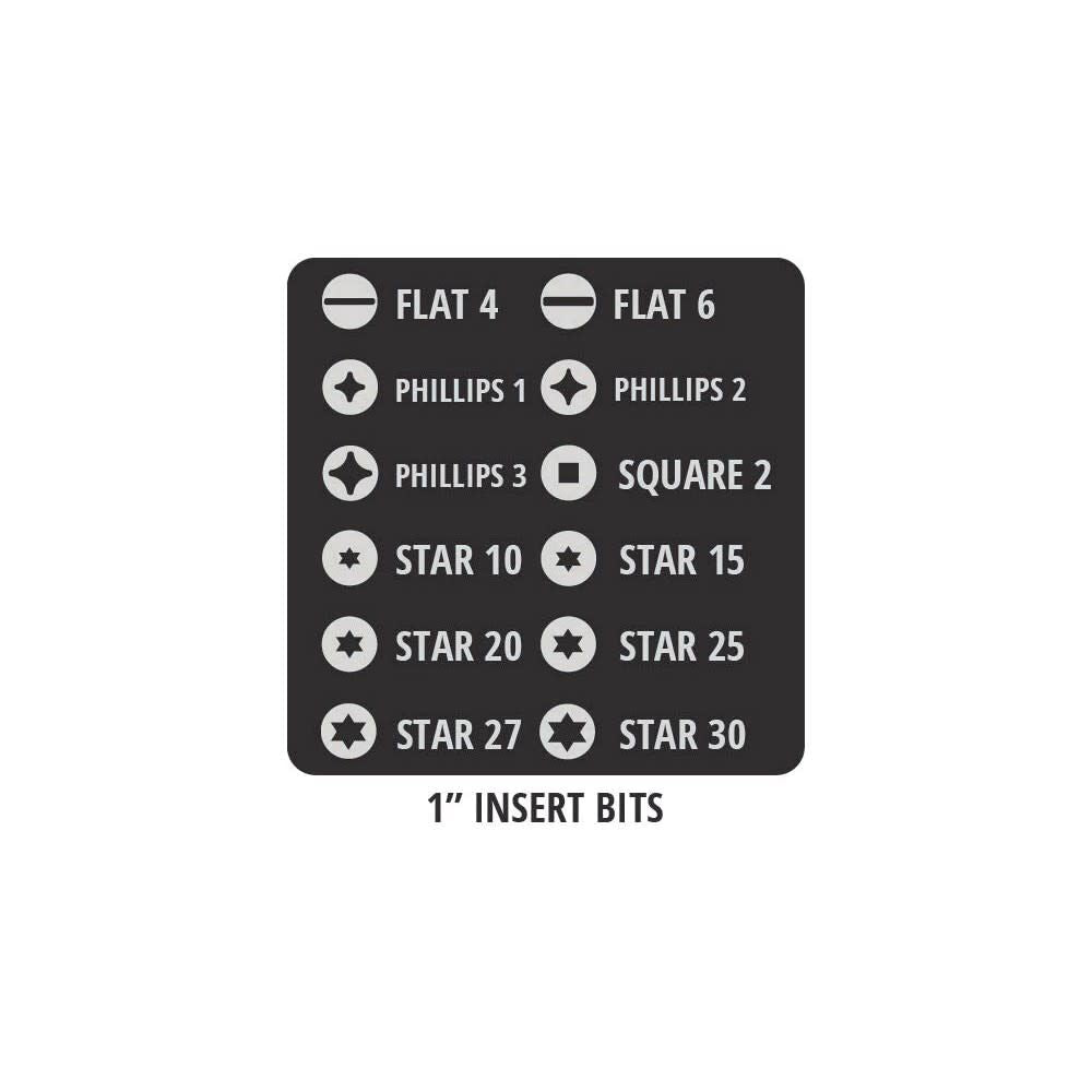 Loaded with 12-one inch insert bits made from S2 industrial grade steel, this assortment of bit types and sizes provides the most suitable tips for driving automotive screws.