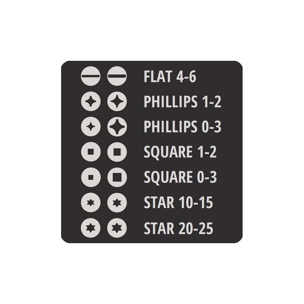 - Bit Load - Phillips 0-3, Phillips 1-2, Torx 10-15, Torx 20-25, Square 0-3, Square 1-2, Flat 4-6, 1/4 In. Hex Shaft